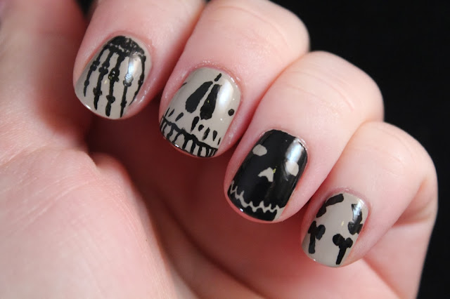 So we have his hand on the far left, a close-up of the skeleton's face next, a full face on the ring finger, and some bones on the pinky. What do you think? Like I said before, I like scary without gore so this fits me pretty well.