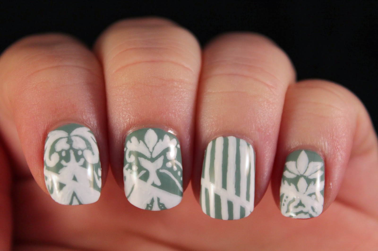 Hey Hunnies! So I wanted to create a freehand damask design on my nails today...but of course I couldn't just leave it at that- so I decided to invert the tips of my nails. Hopefully it's coming across. Basically, the part of the damask that was painted in white on one half of the nail was switched to the divine OPI Thanks a Windmillion on the other half. You might have to look closely on this one ;)